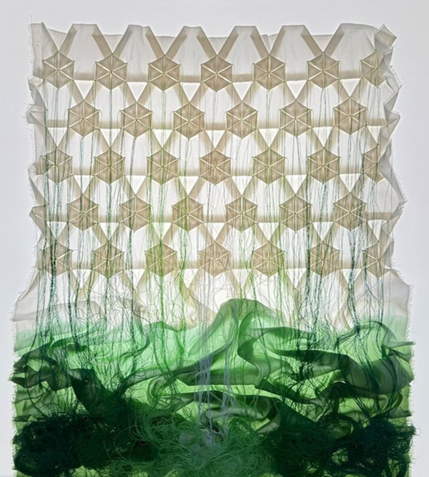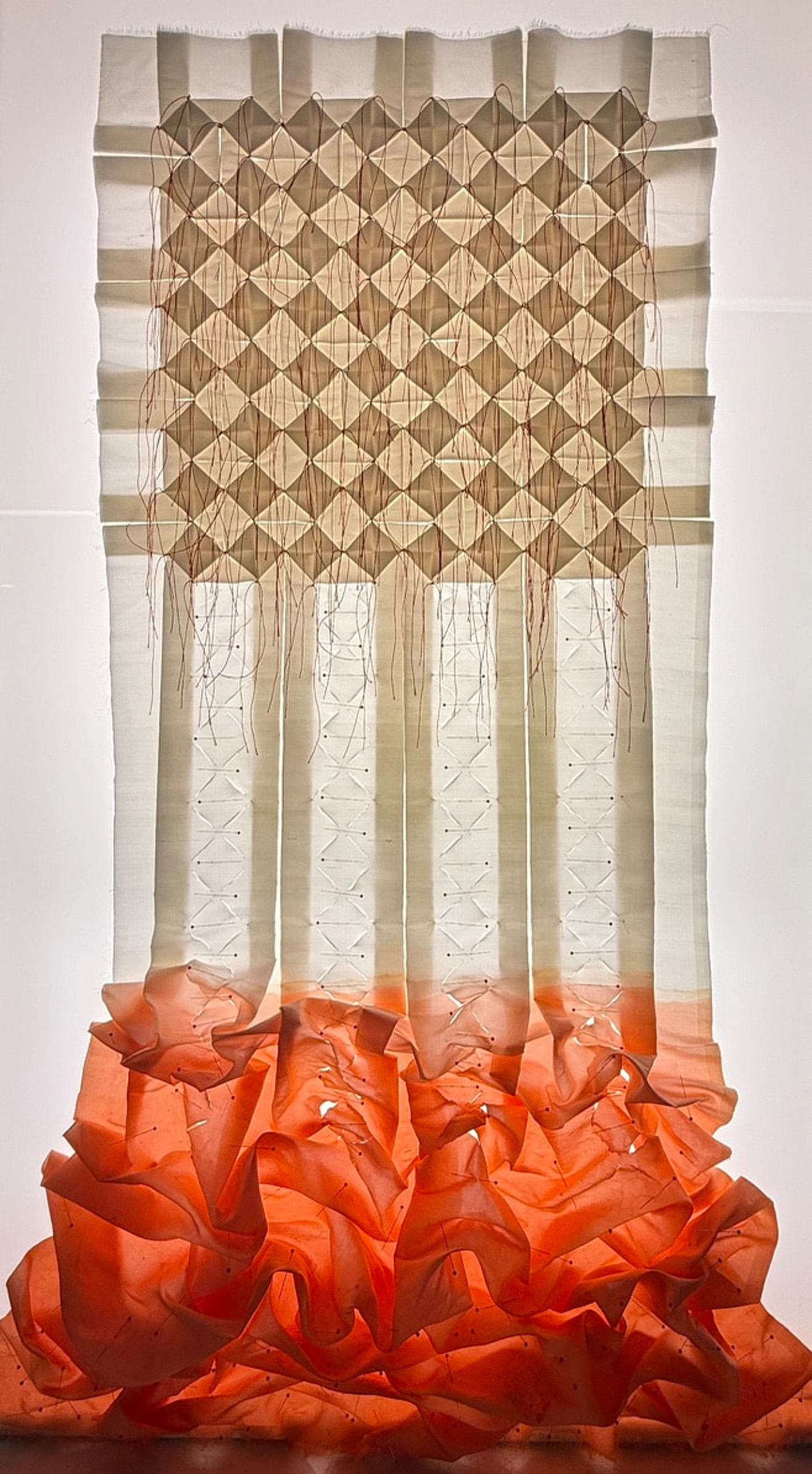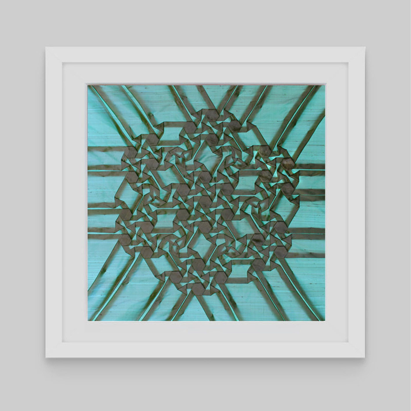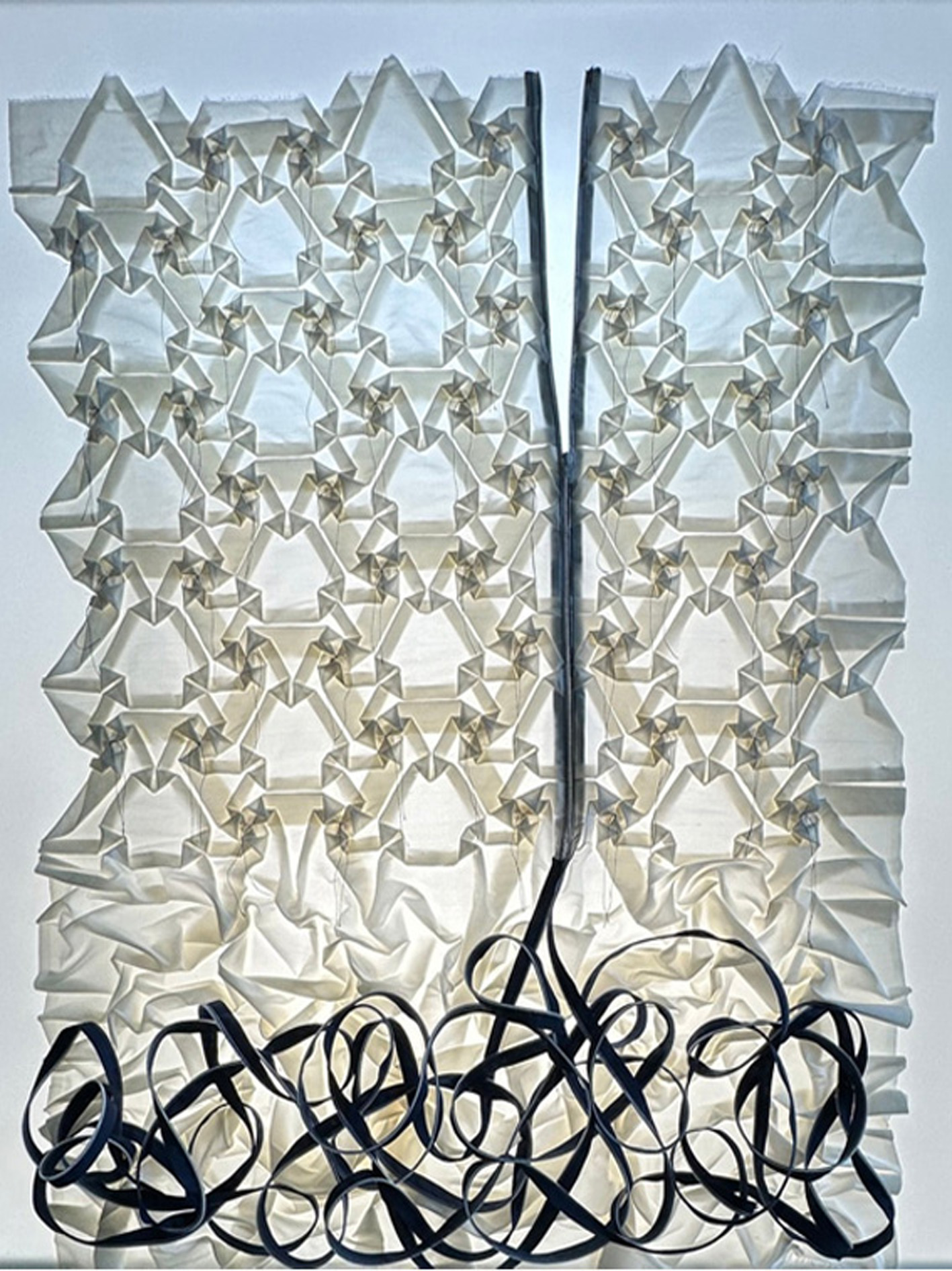 Partiendo de una única pieza de seda, sin necesidad de cortar ni coser, creo patrones y series geométricas complejas dando vida a composiciones tridimensionales e infinitas, desafiando la percepción convencional del arte textil más táctil. Además, encapsulo estas obras en cajas de luz, añadiendo un contraste que resalta la profundidad y la radiografía de mis creaciones.